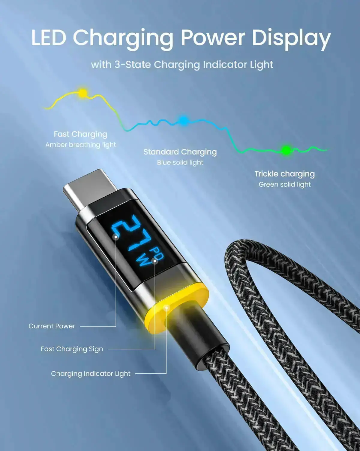 - Pioneer 3-stage LED Indicators: The charging state of your devices are shown by a three-color LED light: amber breathing light (rapid charging), blue solid light (standard charging), and green solid light (trickle charging), ensuring that you are constantly aware of your device's charge levels and make safety visible.